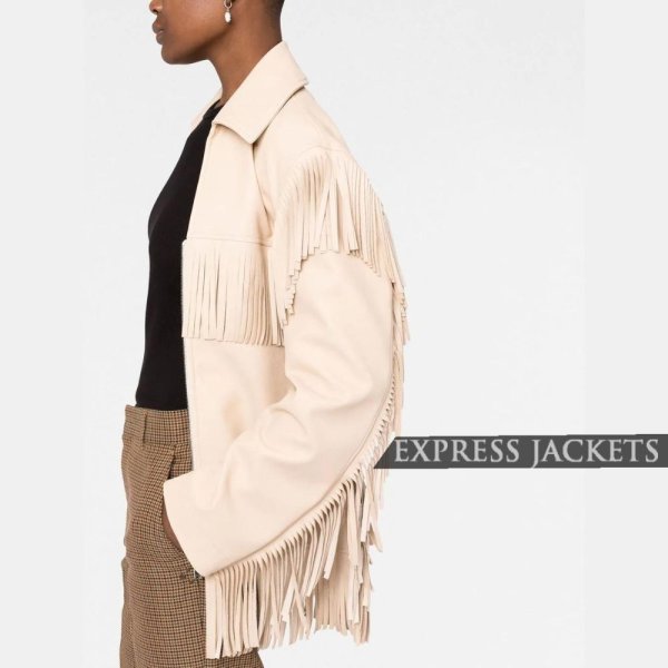 Price range: £110.00 through £140.00Women’s Beige Faux Leather Fringe Zip-Up Jacket