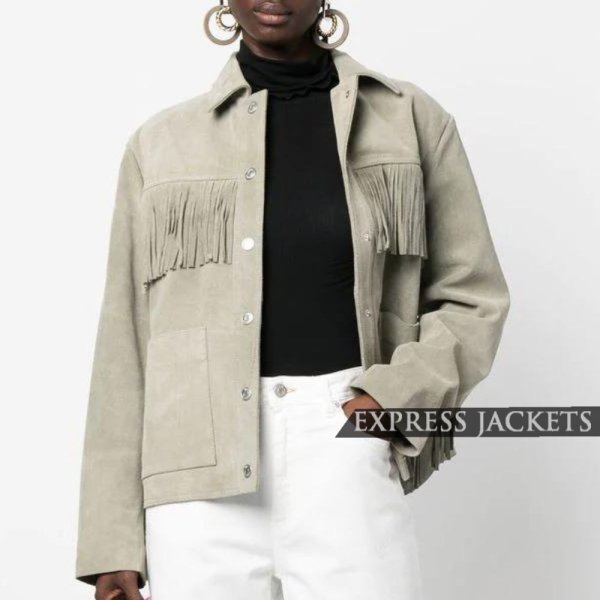 Women’s Light Olive Green Fringe-Detail Suede Jacket